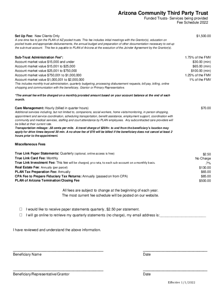 Arizona Community Third Party Trust Funded Trusts Services being provided Fee Schedule 2022Set Up Fee: New Clients Only$1,500.00A onetime fee to join the PLAN of AZ pooled trusts. This fee includes