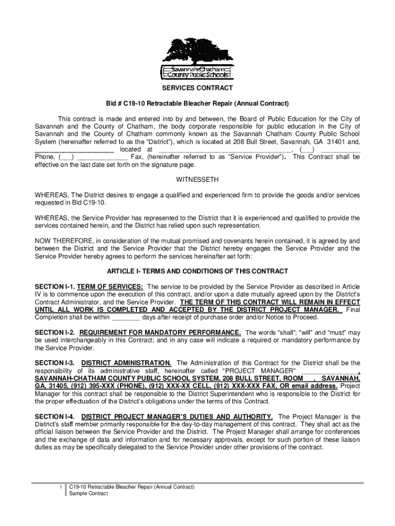 SERVICES CONTRACT Bid # C1910 Retractable Bleacher Repair (Annual Contract) This contract is made and entered into by and between, the Board of Public Education for the City of Savannah and the County