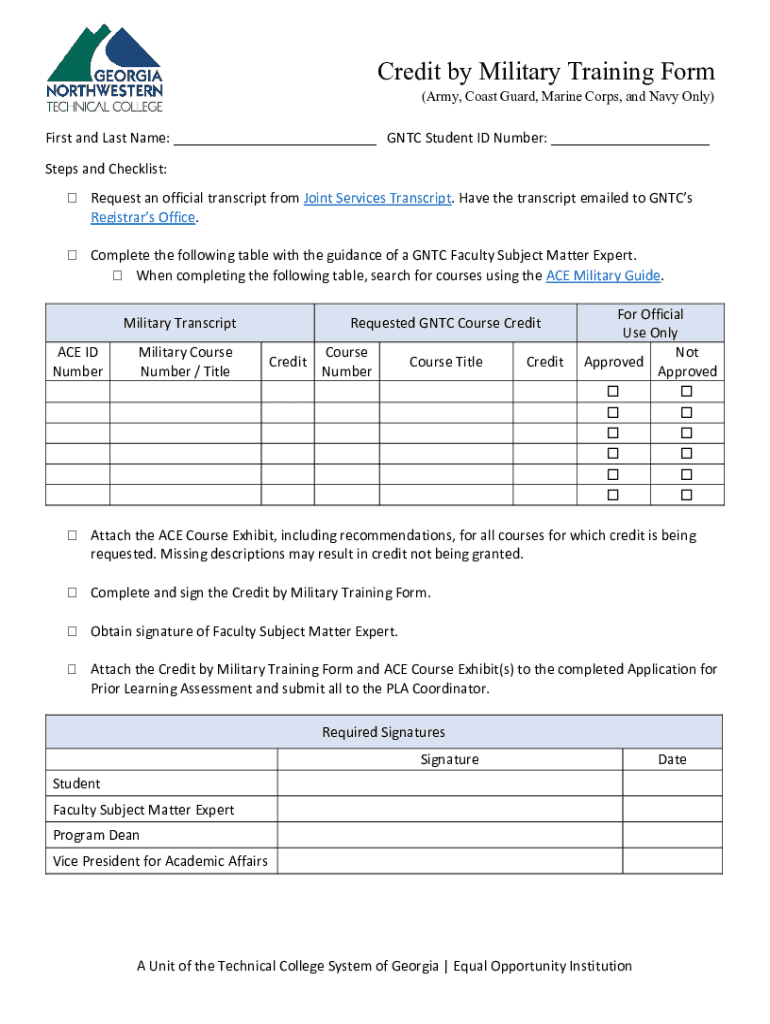 Credit by Military Training FormNORTHWESTERN(Army, Coast Guard, Marine Corps, and Navy Only)TECHNICAL COLLEGEFirst and Last Name: ___ GITC Student ID Number: ___ Steps and Checklist: Request an official