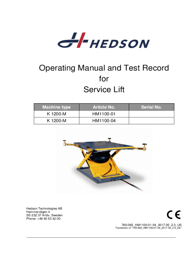 Get the free Operating Manual and Test Record for Service Lift