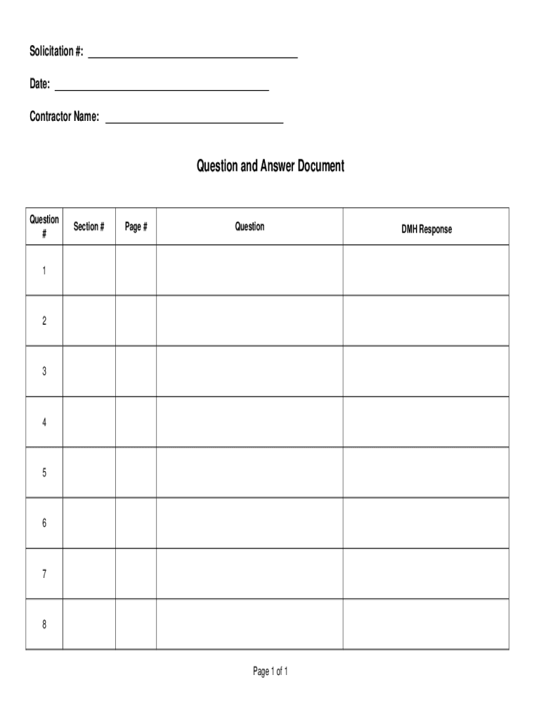 Solicitation #: ___ Date: ___ Contractor Name: ___Question and Answer Document Question #Section #Page #Question12345678Page 1 of 1DMH Response