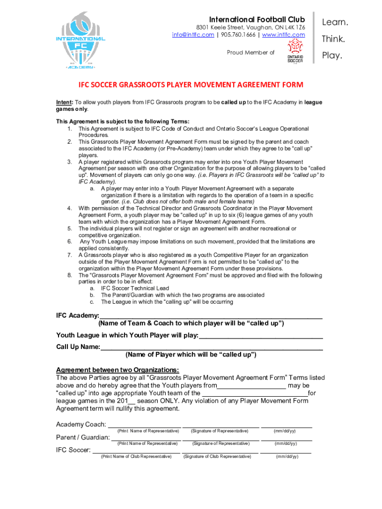 International Football Club8301 Keel Street, Vaughan, ON L4K 1Z6 info@intlfc.com | 905.760.1666 | www.intlfc.com Proud Member offered. Think. Play.IFC SOCCER GRASSROOTS PLAYER MOVEMENT AGREEMENT FORM