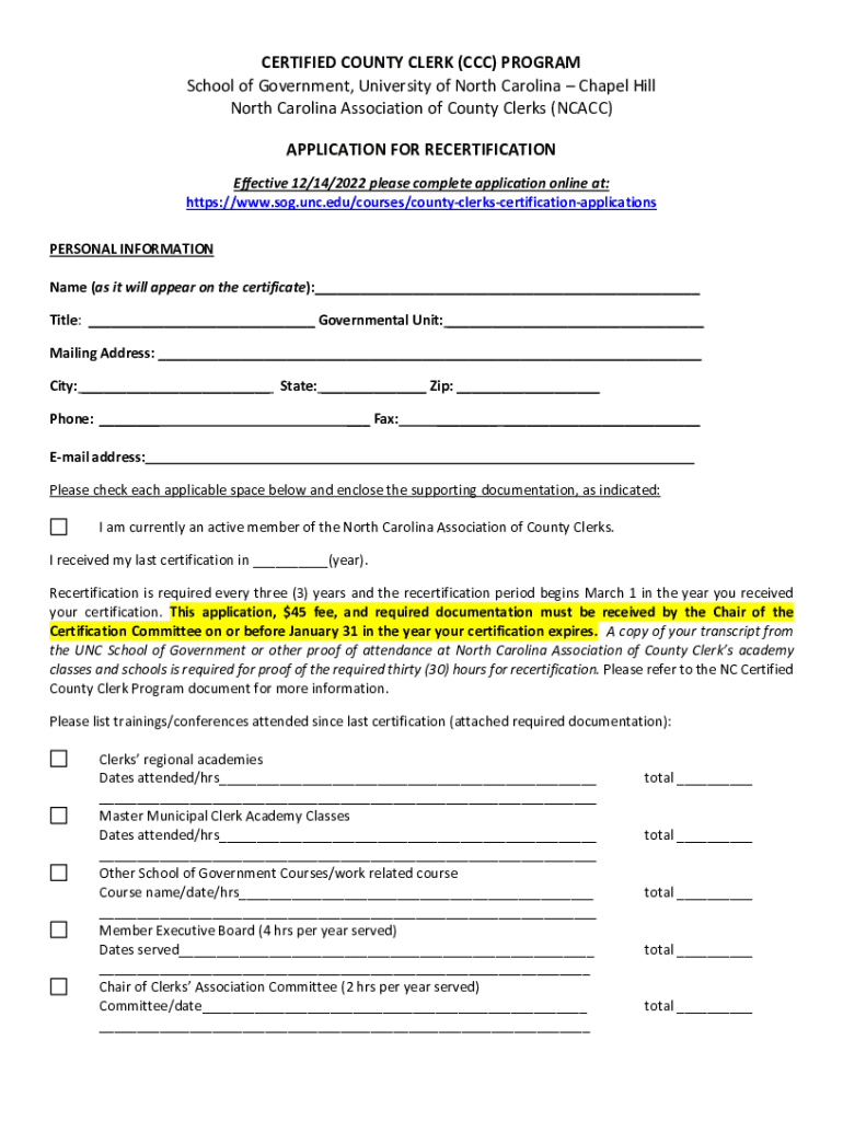 CERTIFIED COUNTY CLERK (CCC) PROGRAM School of Government, University of North Carolina Chapel Hill North Carolina Association of County Clerks (NC ACC) APPLICATION FOR RECERTIFICATION Effective 12/14/2022