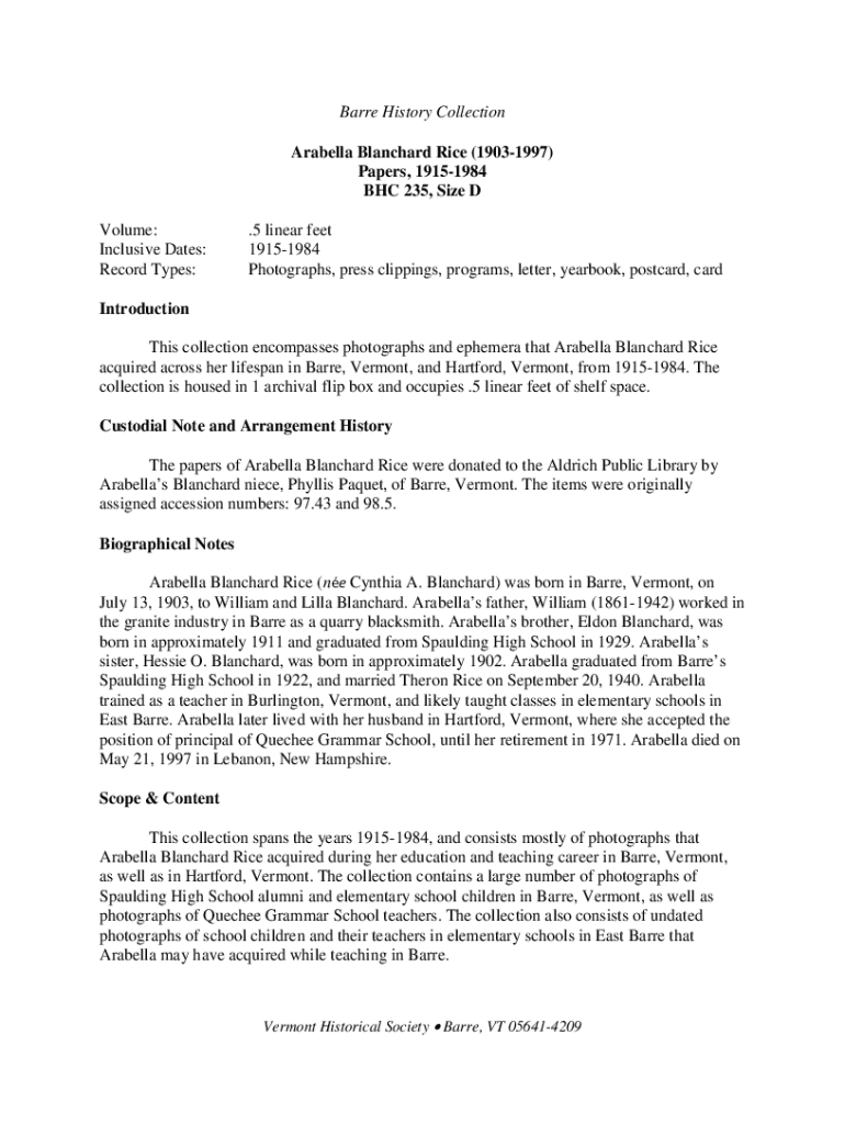 Barre History Collection Arabella Blanchard Rice (19031997) Papers, 19151984 BHC 235, Size D Volume: Inclusive Dates: Record Types:.5 linear feet 19151984 Photographs, press clippings, programs, letter,