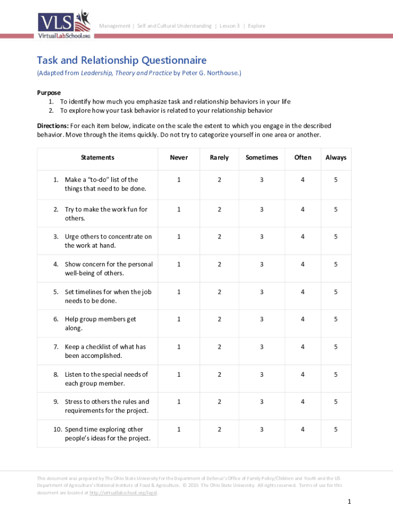 Management | Self and Cultural Understanding | Lesson 3 | Explorers and Relationship Questionnaire (Adapted from Leadership, Theory and Practice by Peter G. Courthouse.) Purpose 1. To identify how