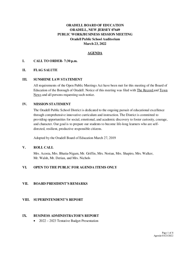 ORDEAL BOARD OF EDUCATION ORDEAL, NEW JERSEY 07649 PUBLIC WORK/BUSINESS SESSION MEETING Ora dell Public School Auditorium March 23, 2022, AGENDA I.CALL TO ORDER 7:30 p.m.II.FLAG SALUTE.SUNSHINE LAW