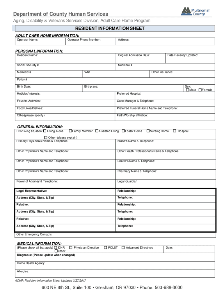 Department of County Human Services Aging, Disability & Veterans Services Division, Adult Care Home Program RESIDENT INFORMATION SHEET ADULT CARE HOME INFORMATION: Operator Name:Operator Phone Number:Address:PERSONAL