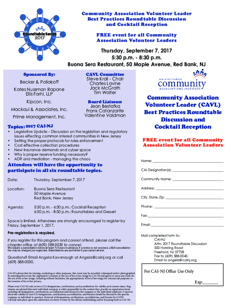 Community Association Volunteer Leader Best Practices Roundtable Discussion and Cocktail Reception Roundtable SeriesFREE event for all Community Association Volunteer Leaders2017Thursday, September