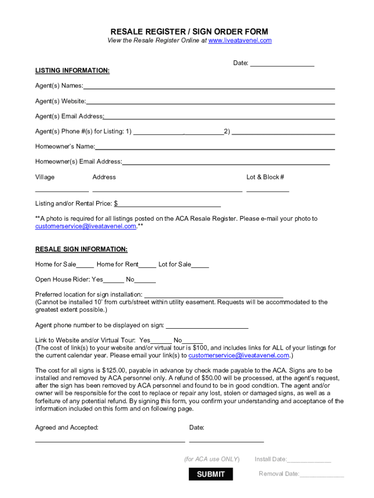 RESALE REGISTER / SIGN ORDER Former the Resale Register Online at www.liveatavenel.com Date: ___LISTING INFORMATION: Agent(s) Names: Agent(s) Website: Agent(s) Email Address: Agent(s) Phone #(s) for
