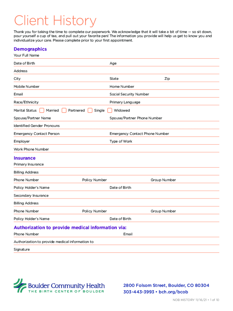 Client History Thank you for taking the time to complete our paperwork. We acknowledge that it will take a bit of time so sit down, pour yourself a cup of tea, and pull out your favorite pen! The
