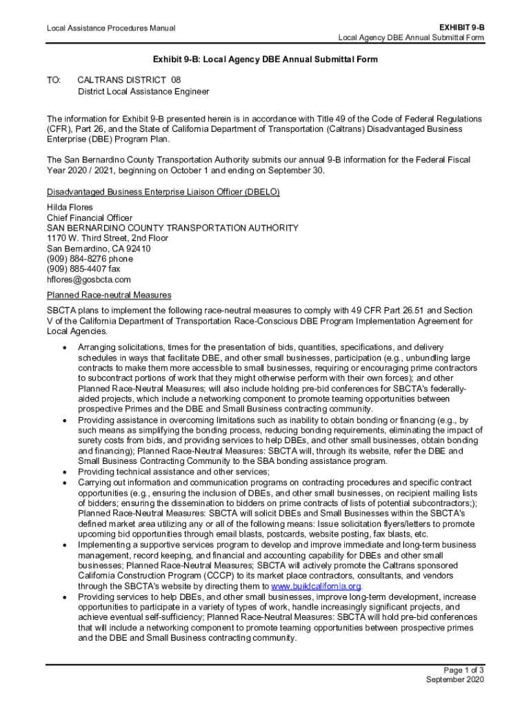 Get the free Exhibit 9-B: Local Agency DBE Annual Submittal Form TO ...