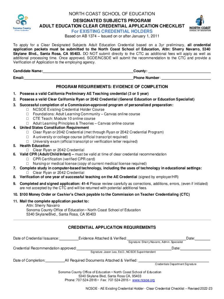 NORTH COAST SCHOOL OF EDUCATION Sonoma County Office of EducationDESIGNATED SUBJECTS PROGRAM ADULT EDUCATION CLEAR CREDENTIAL APPLICATION CHECKLIST For EXISTING CREDENTIAL HOLDERSNORTHCOAST SCHOOL
