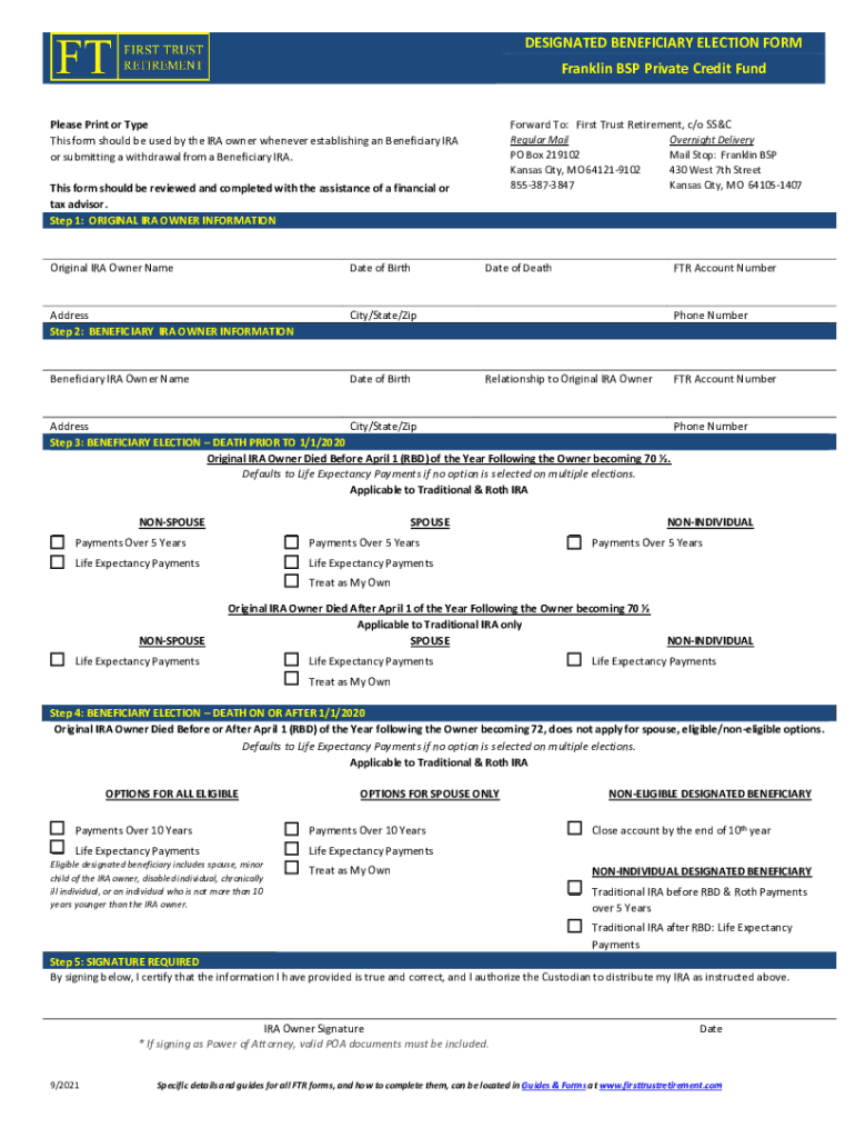 DESIGNATED BENEFICIARY ELECTION FORM Franklin BSP Private Credit Fund Please Print or Type This form should be used by the IRA owner whenever establishing a Beneficiary IRA or submitting a withdrawal