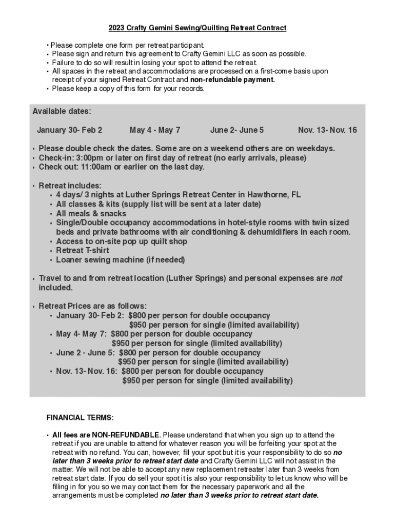 2023 Crafty Gemini Sewing/Quilting Retreat Contract Please complete one form per retreat participant. Please sign and return this agreement to Crafty Gemini LLC as soon as possible. Failure to do