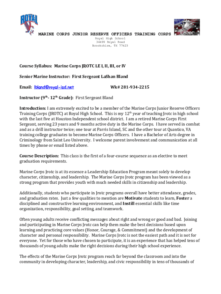 MARINE CORPS JUNIOR RESERVE OFFICERS TRAINING CORPS Royal High School 34499 Royal Road Brookshire, TX 77423Course Syllabus: Marine Corps ROTC LE I, II, III, or IV Senior Marine Instructor: First Sergeant
