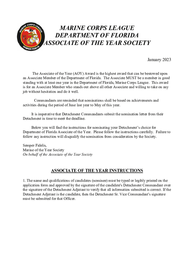 MARINE CORPS LEAGUE DEPARTMENT OF FLORIDA ASSOCIATE OF THE YEAR SOCIETY January 2023 The Associate of the Year (ANY) Award is the highest award that can be bestowed upon an Associate Member of the