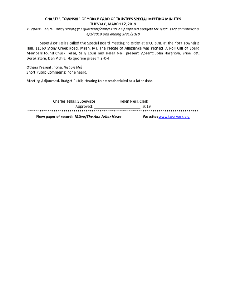 CHARTER TOWNSHIP OF YORK BOARD OF TRUSTEES SPECIAL MEETING MINUTES TUESDAY, MARCH 12, 2019, Purpose hold Public Hearing for questions/comments on proposed budgets for Fiscal Year commencing 4/1/2019