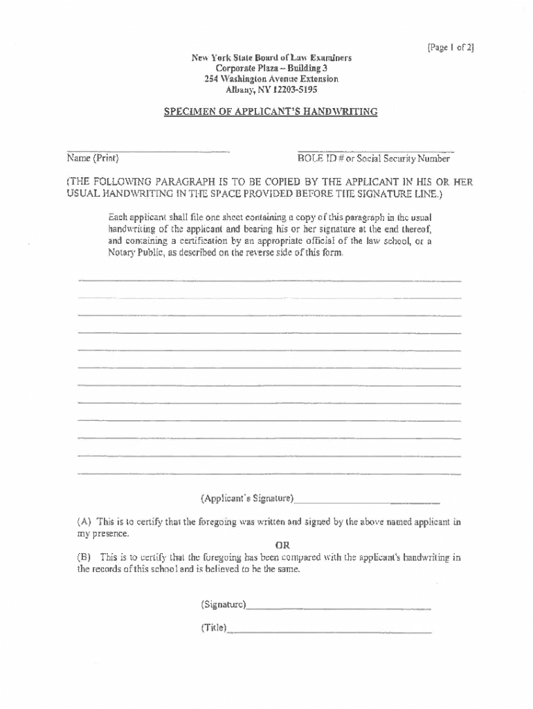 [Page 1 of 2]New York State Board of Law Examiners CorporatePlaza Building 3 254 Washington Avenue EA1ension Albany, NY 122035195SPECIMEN OF APPLICANT\'S HANDVRITINGName (Print)BOLE ID # or Social