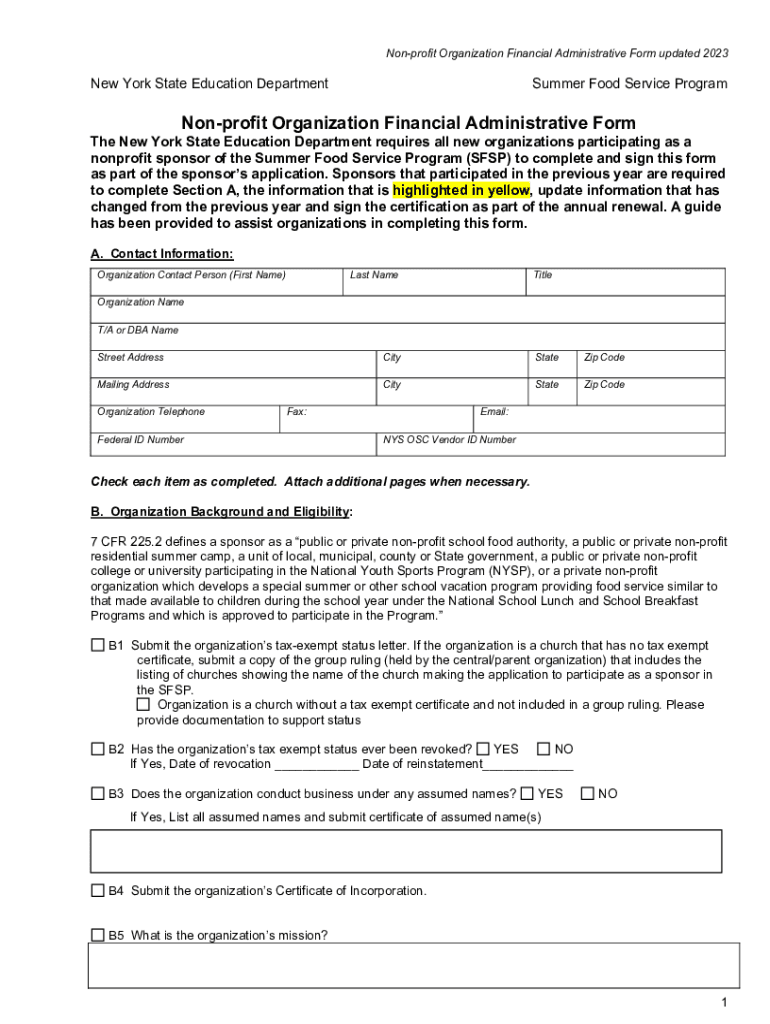 Nonprofit Organization Financial Administrative Form updated 2023New York State Education Department Summer Food Service ProgramNonprofit Organization Financial Administrative Forth New York State
