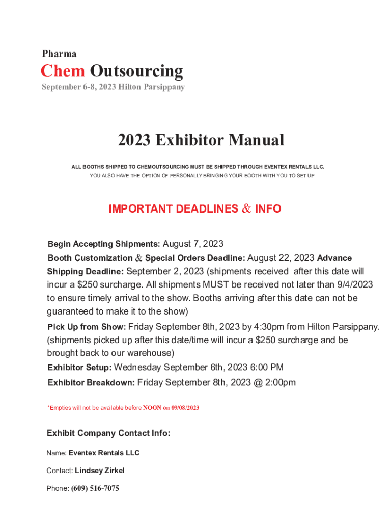 Pharmacies Outsourcing September 68, 2023 Hilton Parsippany2023 Exhibitor Manual ALL BOOTHS SHIPPED TO CHEMOUTSOURCING MUST BE SHIPPED THROUGH EVENT EX RENTALS LLC. YOU ALSO HAVE THE OPTION OF PERSONALLY