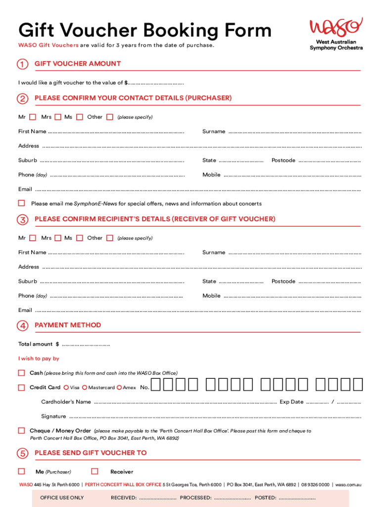 Gift Voucher Booking Form WAS Gift Vouchers are valid for 3 years from the date of purchase.1GIFT VOUCHER AMOUNT would like a gift voucher to the value of $...................................2 Release