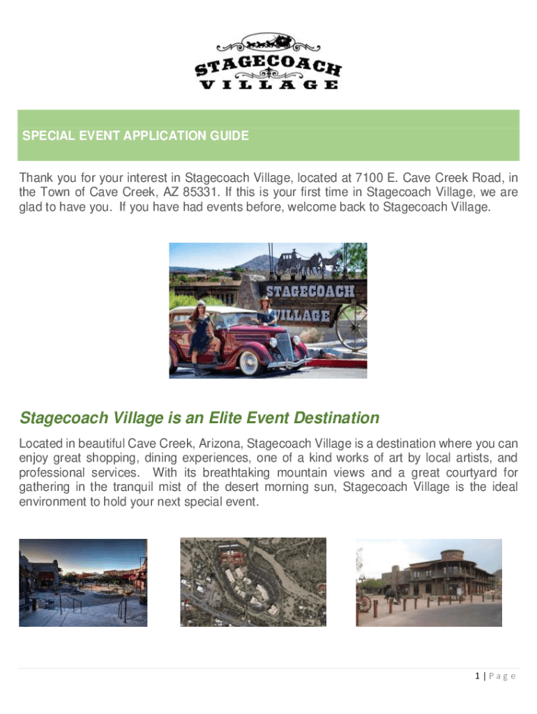 SPECIAL EVENT APPLICATION GUIDE Thank you for your interest in Stagecoach Village, located at 7100 E. Cave Creek Road, in the Town of Cave Creek, AZ 85331. If this is your first time in Stagecoach