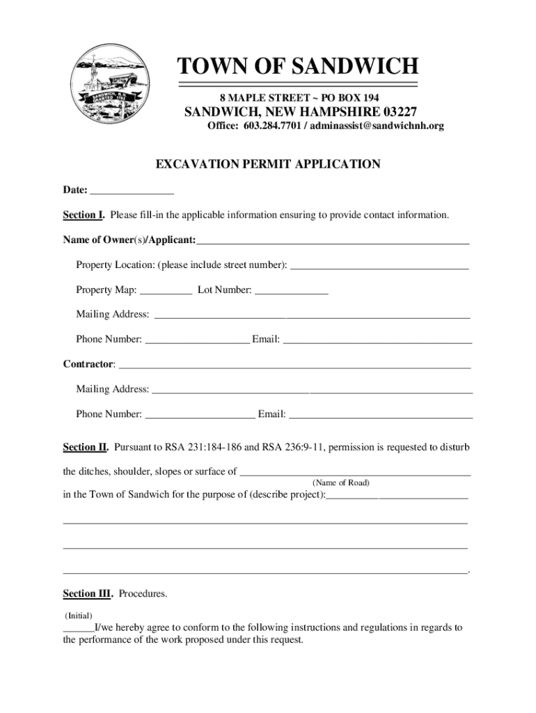 TOWN OF SANDWICH 8 MAPLE STREET PO BOX 194SANDWICH, NEW HAMPSHIRE 03227 Office: 603.284.7701 / adminassist@sandwichnh.orgEXCAVATION PERMIT APPLICATION Date: ___ Section I. Please fill the applicable