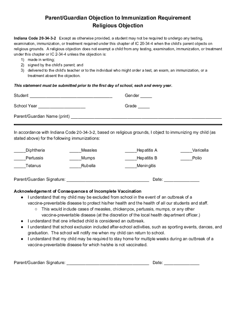 Parent/Guardian Objection to Immunization Requirement Religious Objection Indiana Code 203432 Except as otherwise provided, a student may not be required to undergo any testing, examination, immunization,