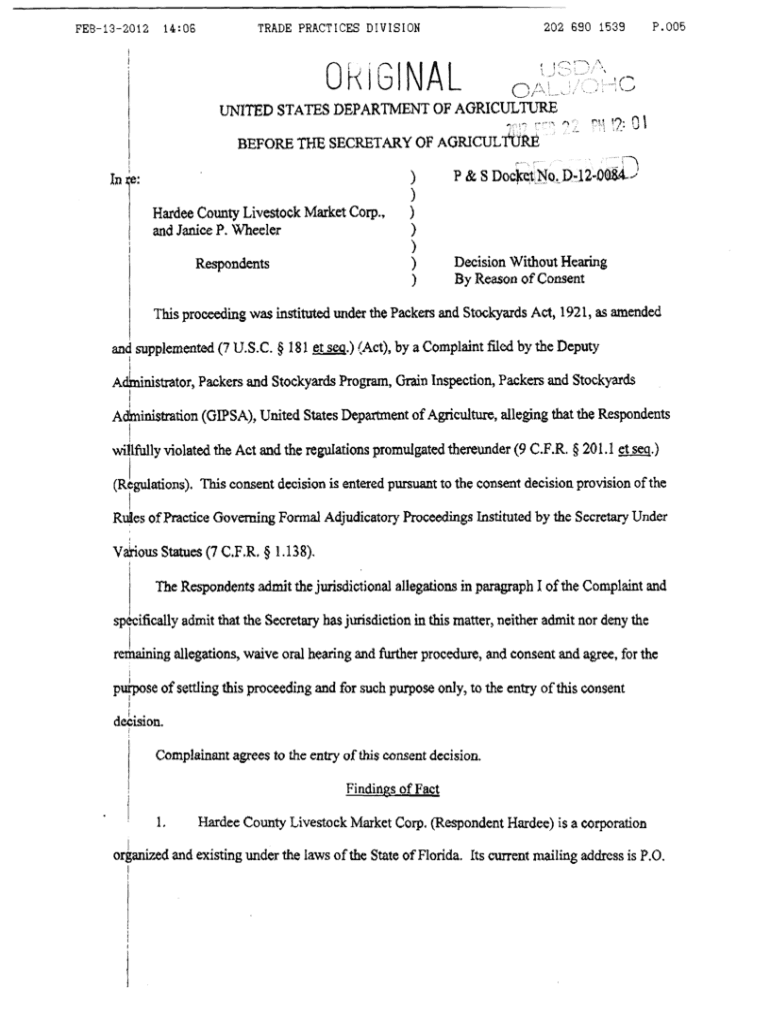 14:06FEB132012202 690 1539TRADE PRACTICES DIVISIONORIGINALP.005OGUNITED STATES DEPARTMENT OF AGRICULTUREBEFORE THE SECRETARY OF AGRICULTURE I'd re:Harder County Livestock Market Corp., and Janice