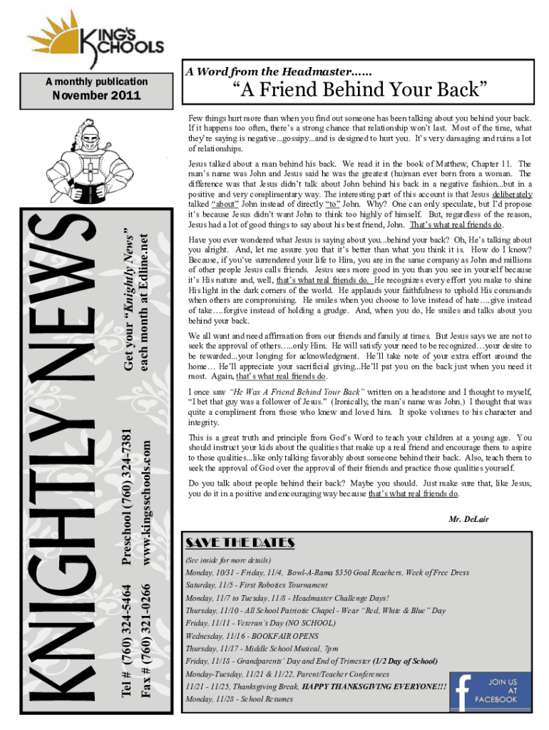 A monthly publication November 2011A Word from the Headmaster Friend Behind Your Backed your Knightly News each month at Edline. Nephew things hurt more than when you find out someone has been talking