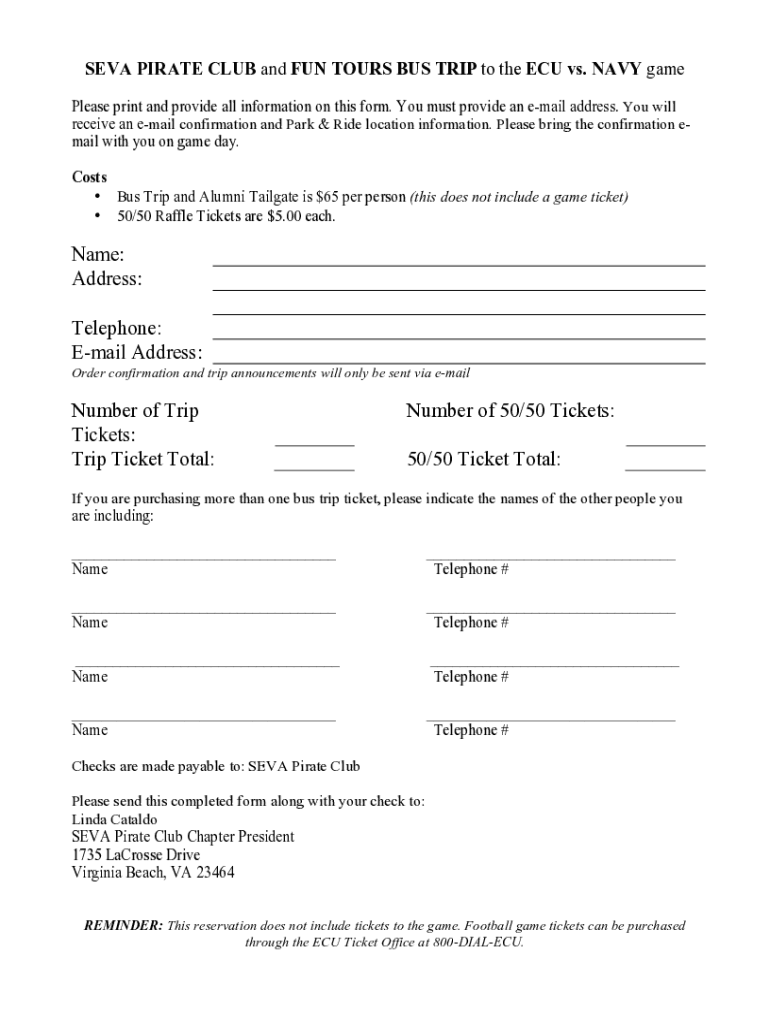 SEA PIRATE CLUB and FUN TOURS BUS TRIP to the ECU vs. NAVY game Please print and provide all information on this form. You must provide an email address. You will receive an email confirmation and