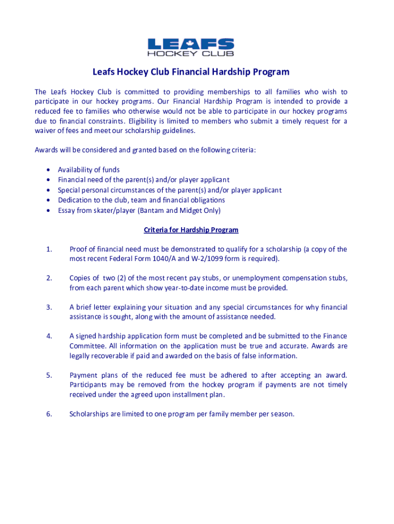 Leafs Hockey Club Financial Hardship Program The Leafs Hockey Club is committed to providing memberships to all families who wish to participate in our hockey programs. Our Financial Hardship Program