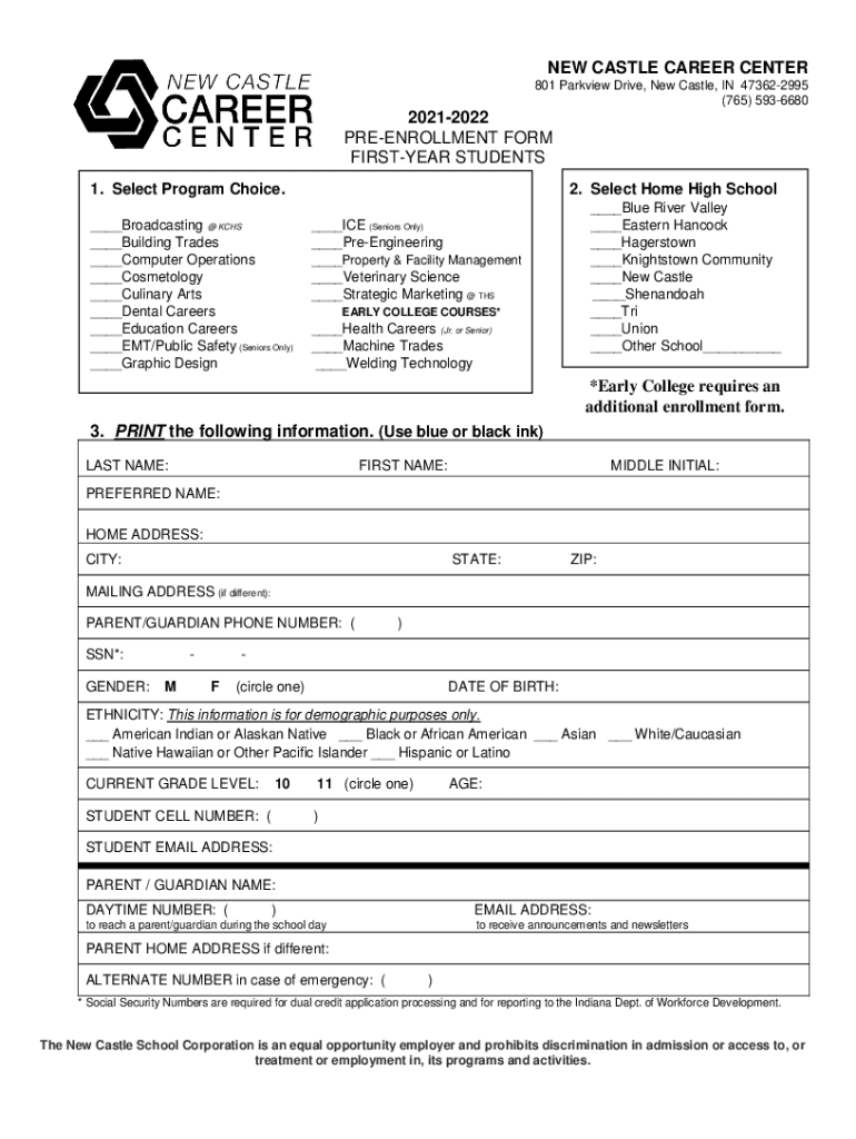 NEW CASTLE CAREER CENTER 801 Park view Drive, New Castle, IN 473622995 (765) 593668020212022 ENROLLMENT FORM FORSTER STUDENTS 1. Select Program Choice. ___Broadcasting @ CHS ___Building Trades ___Computer