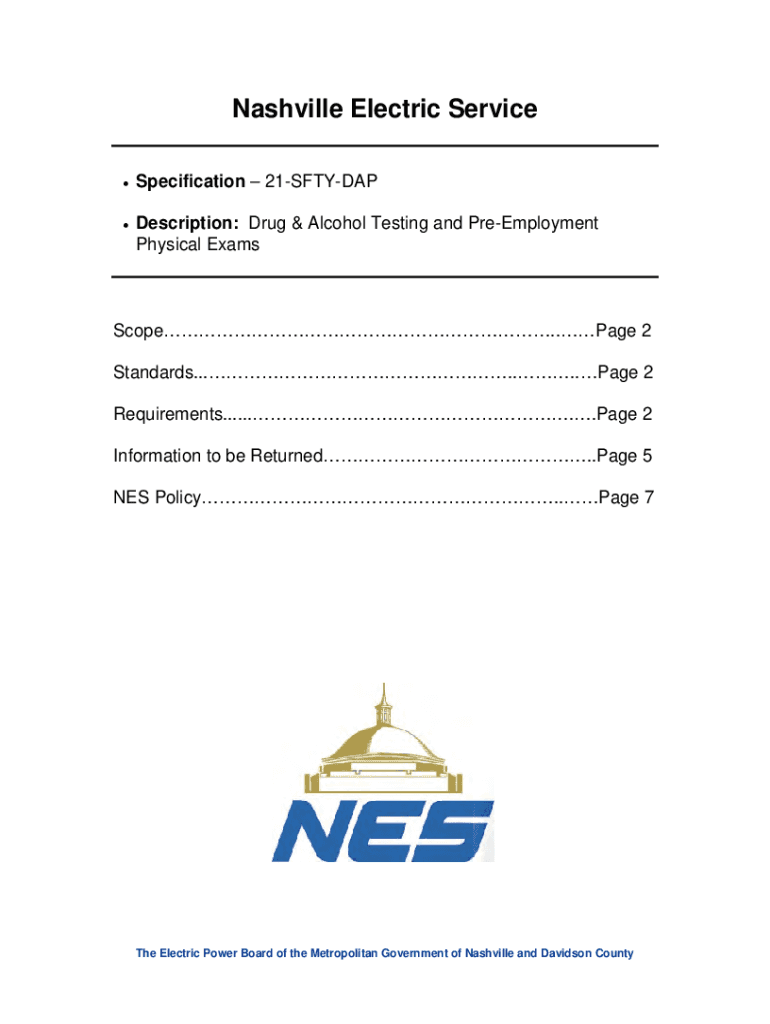 Nashville Electric Service Specification 21SFTYDAPDescription: Drug & Alcohol Testing and PreEmployment Physical ExamsScope. Page 2 Standards....... Page 2 Requirements........ Page 2 Information