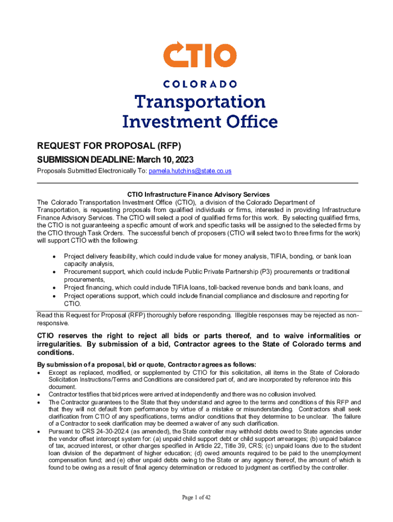 REQUEST FOR PROPOSAL (RFP) SUBMISSION DEADLINE: March 10, 2023Proposals Submitted Electronically To: pamela.hutchins@state.co.us CIO Infrastructure Finance Advisory Services The Colorado Transportation