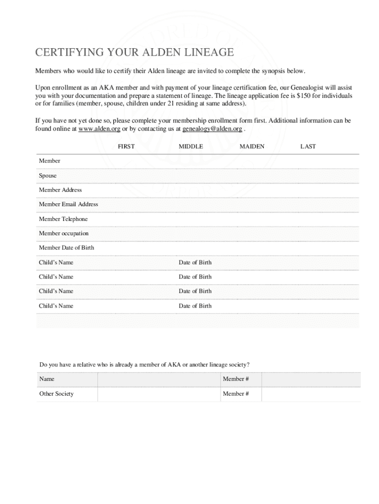 CERTIFYING YOUR ALDEN LINEAGE Members who would like to certify their Alden lineage are invited to complete the synopsis below. Upon enrollment as an AKA member and with payment of your lineage certification