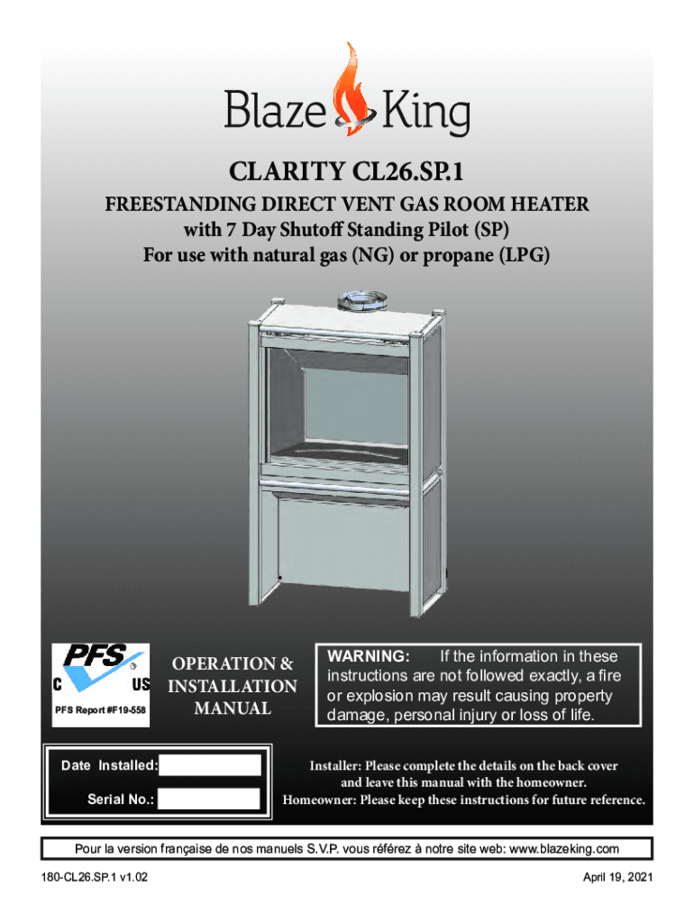 CLARITY CL26.SP.1FREESTANDING DIRECT VENT GAS ROOM HEATER with 7 Day Shutoff Standing Pilot (SP) For use with natural gas (NG) or propane (LPG)PFS Report #F19558OPERATION & INSTALLATION Mandate Installed:
