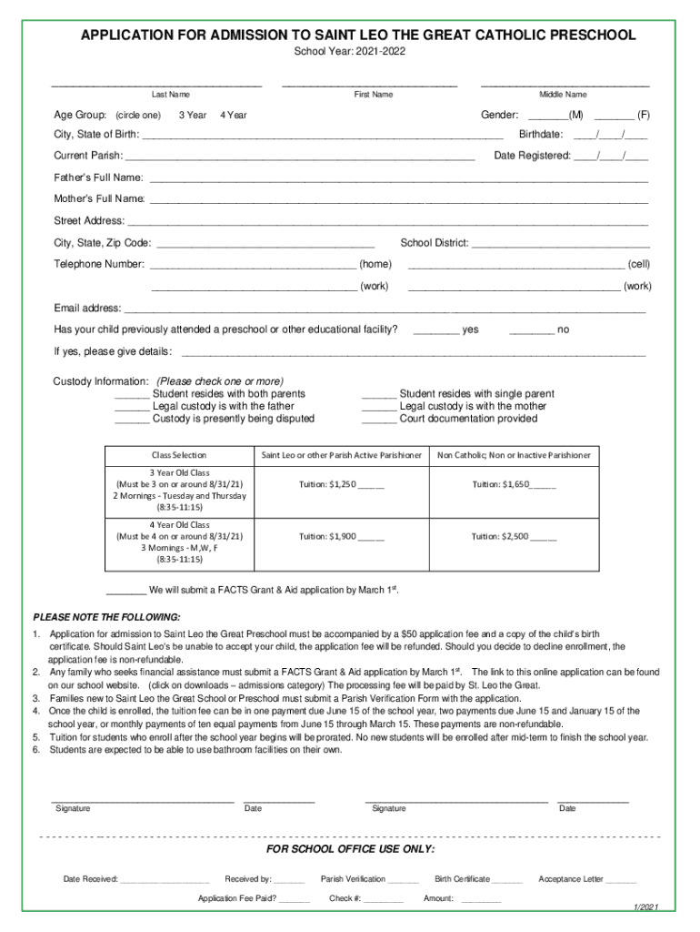APPLICATION FOR ADMISSION TO SAINT LEO THE GREAT CATHOLIC PRESCHOOL