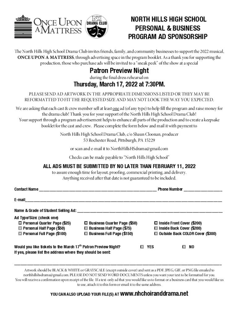 NORTH HILLS HIGH SCHOOL PERSONAL & BUSINESS PROGRAM AD SPONSORSHIP The North Hills High School Drama Club invites friends, family, and community businesses to support the 2022 musical, ONCE UPON A