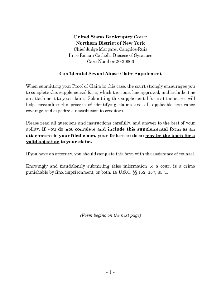 United States Bankruptcy Court Northern District of New York Chief Judge Margaret CangilosRuiz In re Roman Catholic Diocese of Syracuse Case Number 2030663 Confidential Sexual Abuse Claim Supplement