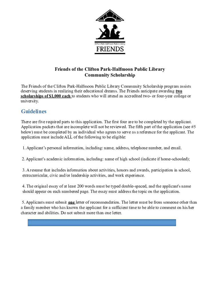 Friends of the Clifton ParkHalfmoon Public Library Community Scholarship The Friends of the Clifton ParkHalfmoon Public Library Community Scholarship program assists deserving students in realizing