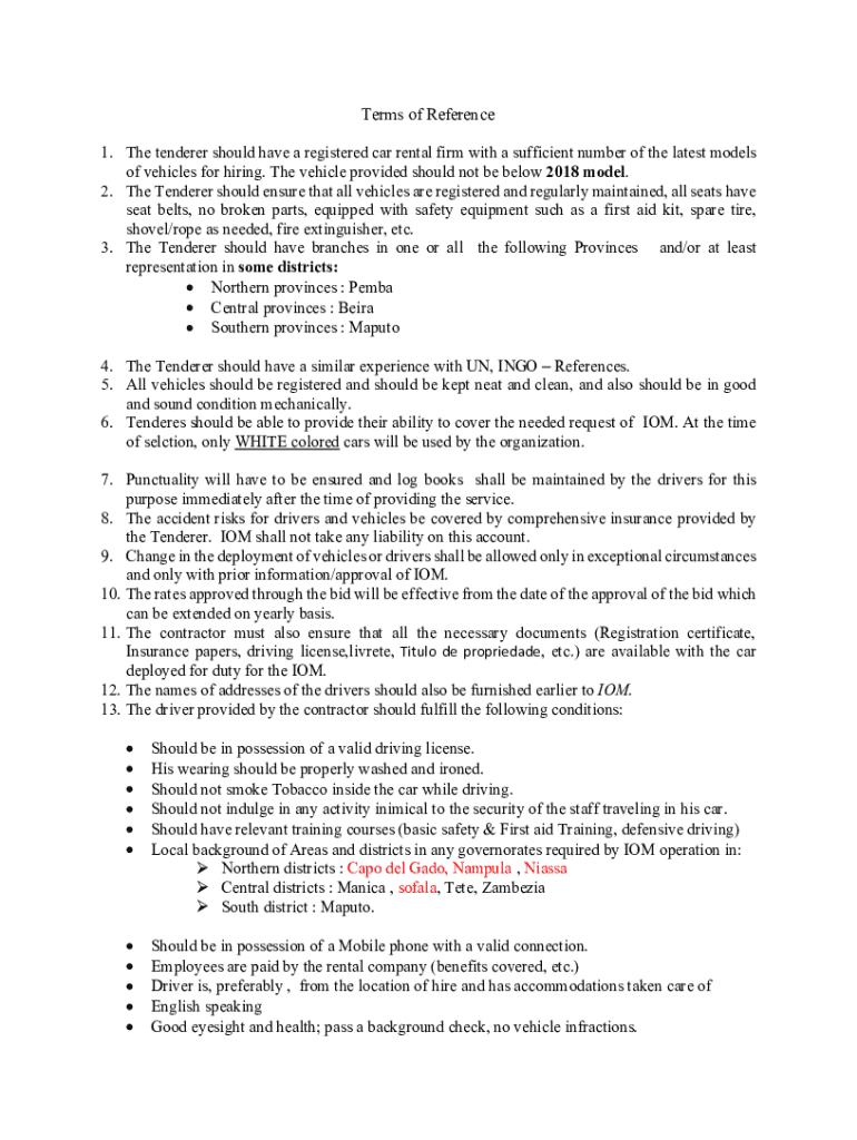 Terms of Reference 1. The tenderer should have a registered car rental firm with a sufficient number of the latest models of vehicles for hiring. The vehicle provided should not be below 2018 model.