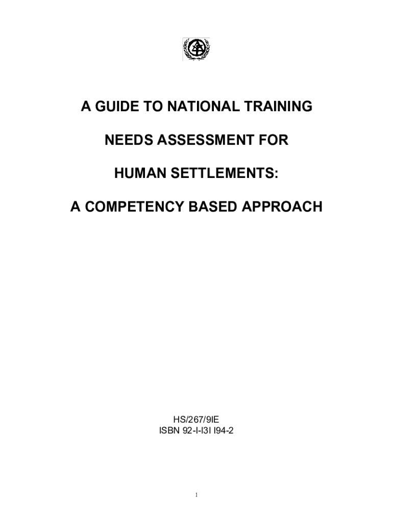 A GUIDE TO NATIONAL TRAINING NEEDS ASSESSMENT FOR HUMAN SETTLEMENTS: A COMPETENCY BASED APPROACHES/267/9IE ISBN 92II3I I9421FOREWORDFor many years, the United Nations Center for Human Settlements