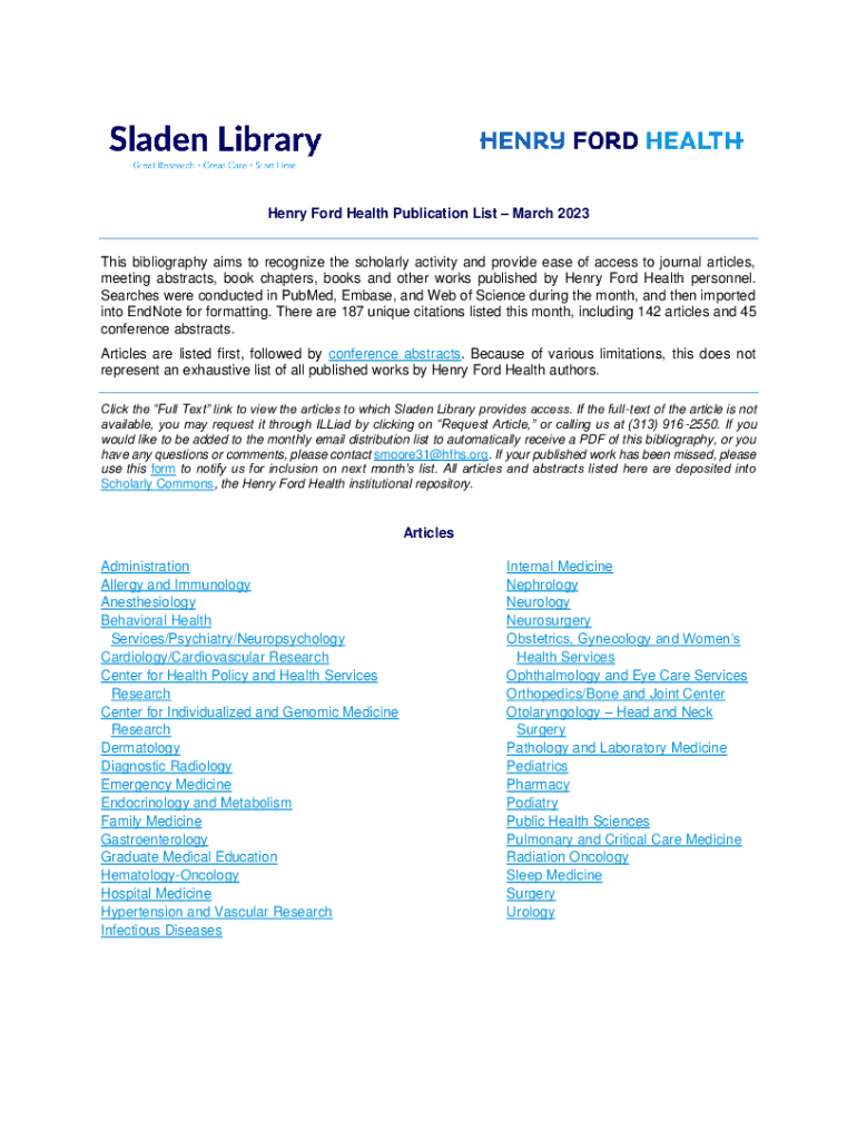 Henry Ford Health Publication List March 2023 This bibliography aims to recognize the scholarly activity and provide ease of access to journal articles, meeting abstracts, book chapters, books and