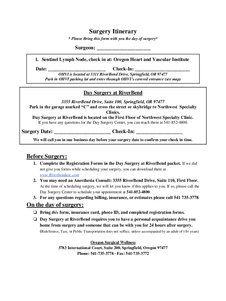 Surgery Itinerary * Please Bring this form with you the day of surgery×Surgeon: ___ 1. Sentinel Lymph Node, check in at: Oregon Heart and Vascular Institute Date: ___Checking: ___OHI is located at