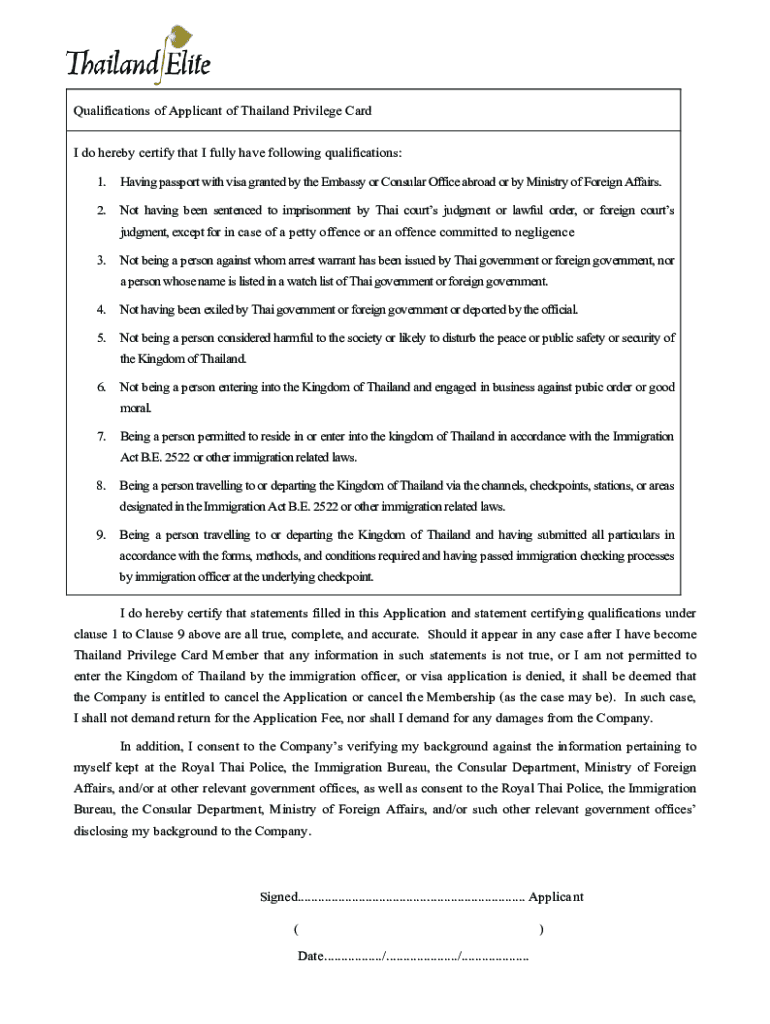 Qualifications of Applicant of Thailand Privilege Card I do hereby certify that I fully have following qualifications: 1. Having passport with visa granted by the Embassy or Consular Office abroad