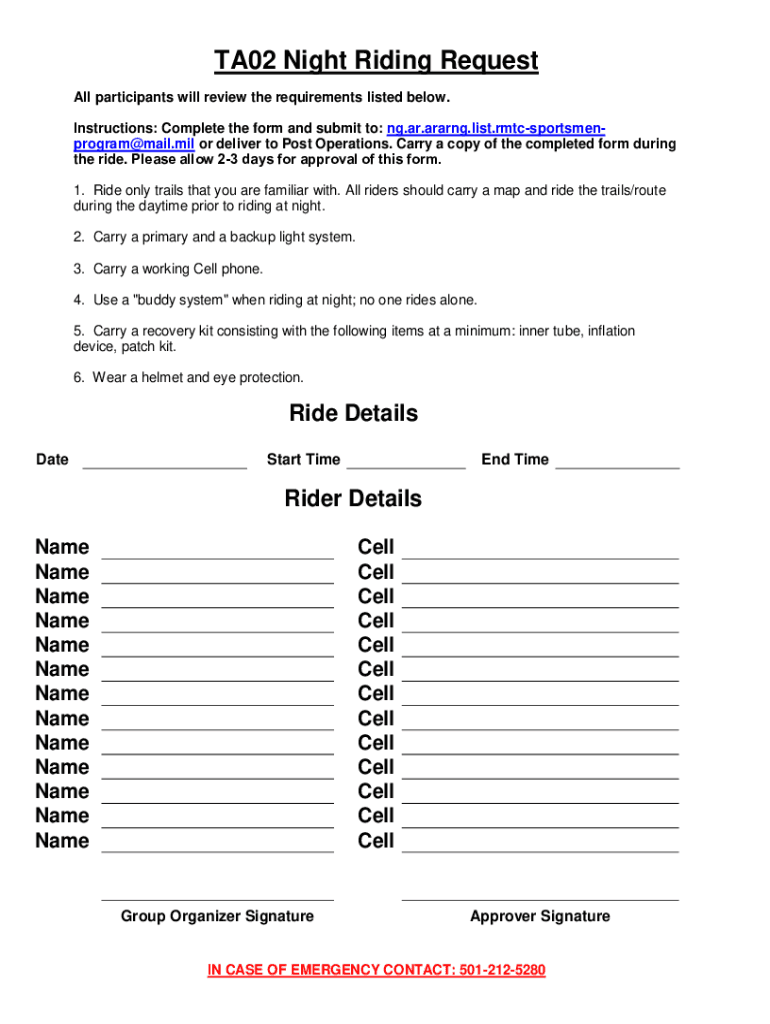 TA02 Night Riding Request All participants will review the requirements listed below. Instructions: Complete the form and submit to: ng.ar.ararng.list.rmtcsportsmenprogram@mail.mil or deliver to Post