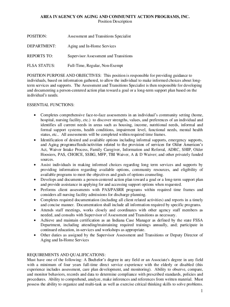 Position DescriptionPOSITION:Assessment and Transitions SpecialistDEPARTMENT:Aging and Income ServicesREPORTS TO:Supervisor Assessment and
