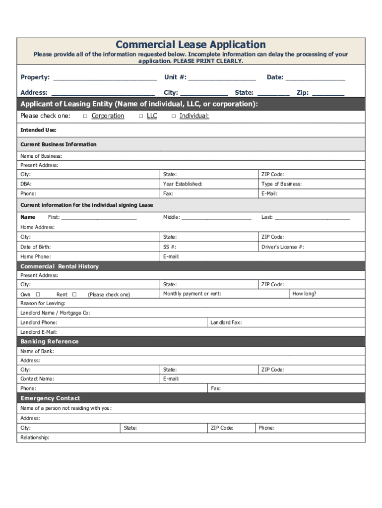 Commercial Lease Application Please provide all the information requested below. Incomplete information can delay the processing of your application. PLEASE PRINT CLEARLY. Property: ___Unit #: ___Address: