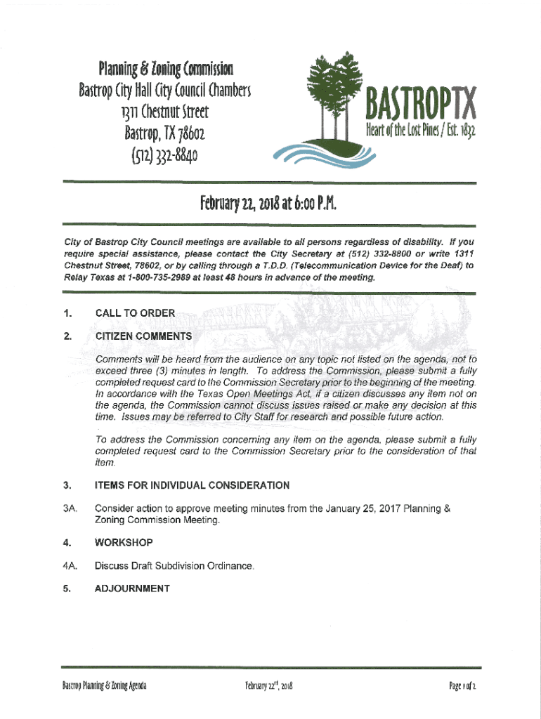 Planning and Zoning Commission Meeting MinutesT he is City of Bastrop Planning and Zoning Commission met Thursday, January 25, 2018, at 6:00 p.m. in the Bastrop City Council Chambers, 1311 Chestnut